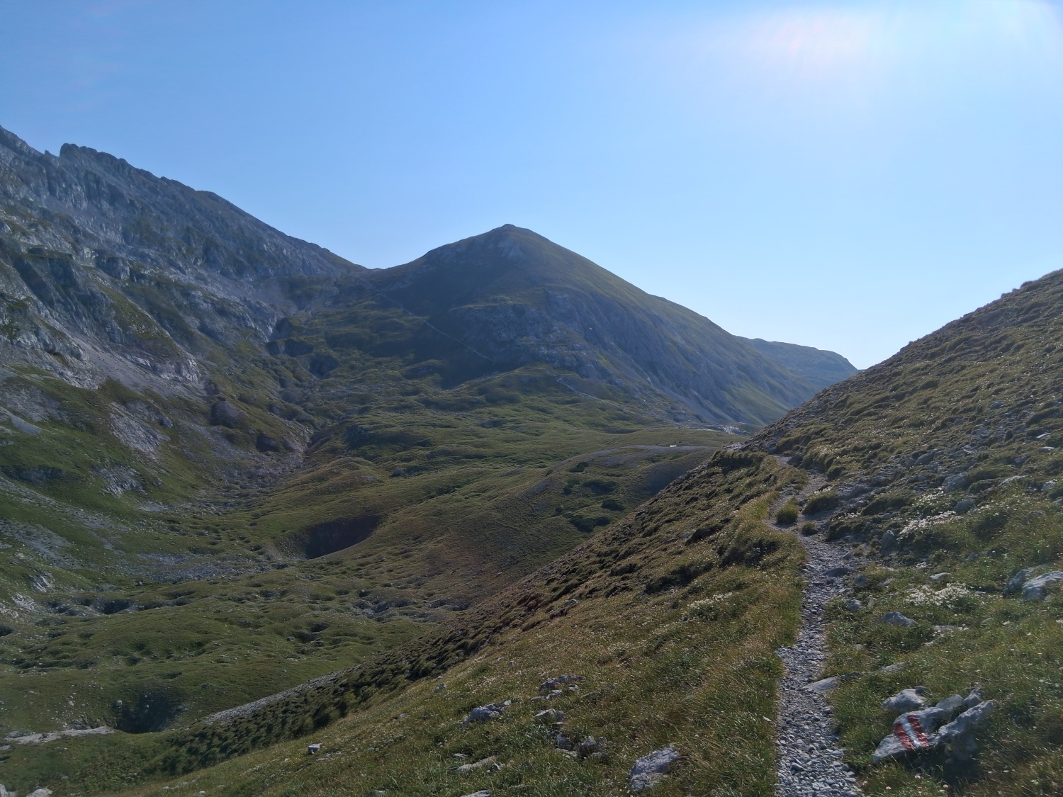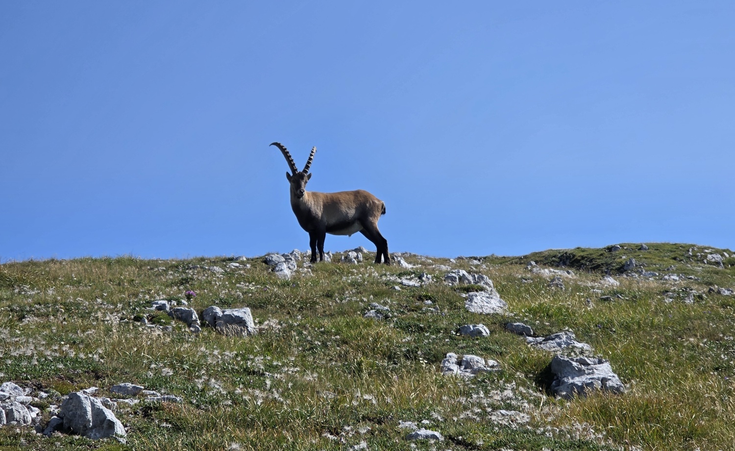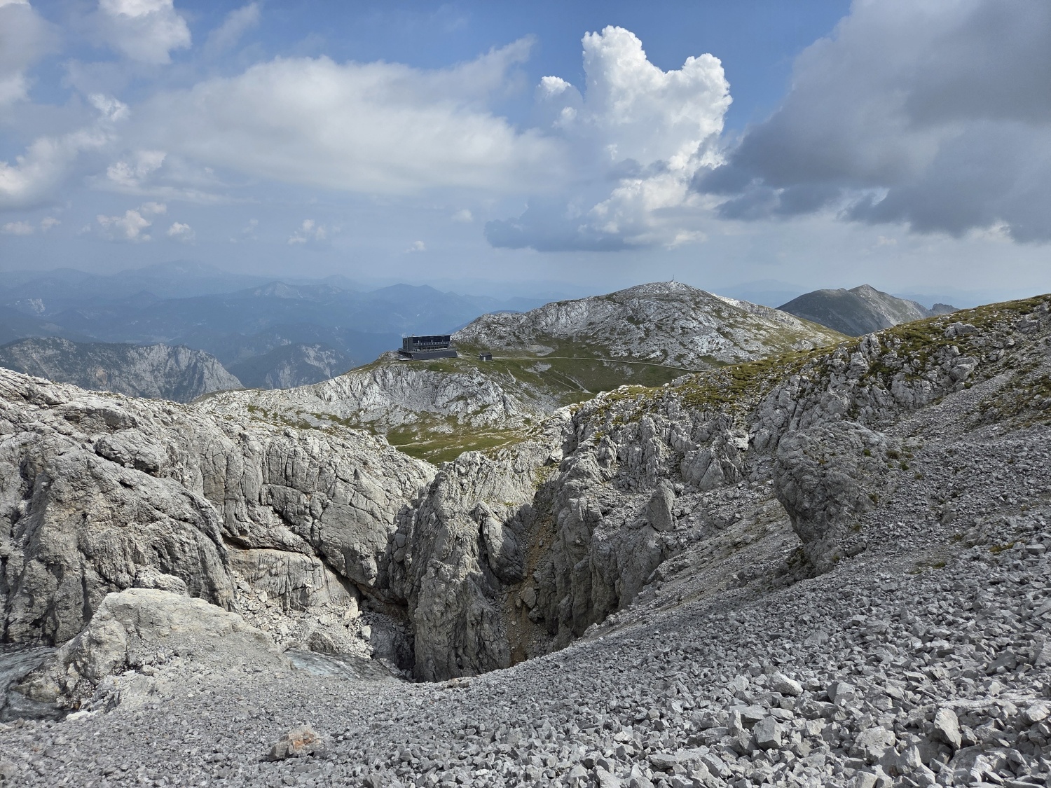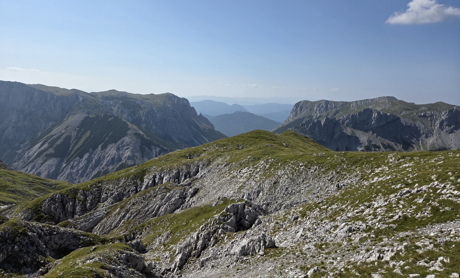Nach der Stärkung am reichhaltigen Frühstücksbüffet führte der Weiterweg durch die Obere Dullwitz Richtung Trawiessattel bis zum Talschluss und zur Abzweigung Richtung Schiestlhaus. Der Weiterweg führte auf dem Graf-Meran-Steig durch zum Teil felsiges Gelände anhaltend steil bergauf bis in den Rotgangboden, wo sich in der Nähe des Weges eine Gruppe von Steinböcken niedergelassen hatte. Das 2. Übernachtungsziel, das Schiestlhaus auf 2156 m auf dem Gipfelplateau war kurz darauf erreicht und nach einer Pause und deponieren eines Teiles des Gepäcks führte der Weg direkt weiter auf den Gipfel des Hochschwab 2277 m, dem höchsten Berg in der Hochschwabgruppe. Nach einer ausgiebigen Brotzeit- und Fotopause stieg man auf schrofigem Boden über den westseitigen Rücken ab zur Fleischer Biwakschachtel und weglos auf den den nächsten Gipfel, den G’hacktkogel 2214 m und ein Teil der Gruppe noch weiter zum Gipfel des Zagelkogel 2255 m, dem zweithöchsten Hochschwabgipfel. Von dort ging es zurück zur Biwakschachtel und auf einer zum Teil steinigen und felsigen Querung unterhalb des Hochschwab-Gipfels zurück zum Schiestlhaus.