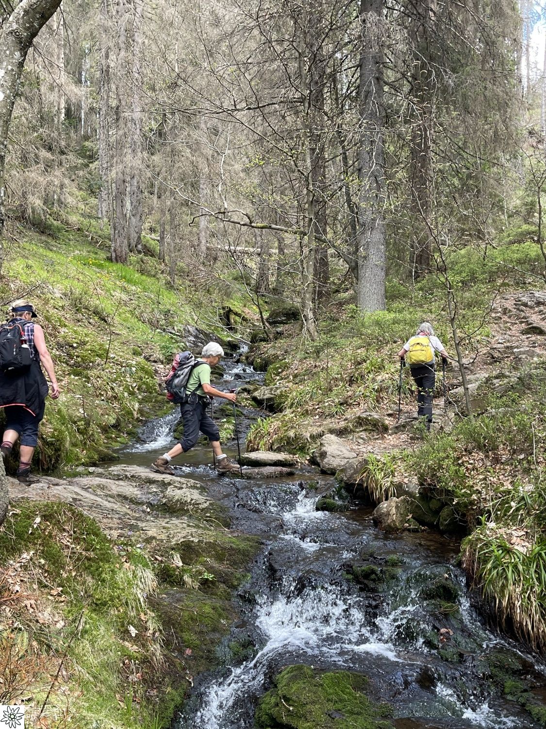 Diese Tour ist eine feste Größe im jährlichen Tourenprogramm der Ortsgruppe. Die Anfahrt ging dieses Mal über Grafenau bis Rinchnach, dann weiter bis Zwiesel und schließlich auf gewohntem Weg nach Scheuereck. Die Ursache dafür war eine Umleitung wegen einer Baustelle in Frauenau. Die Wanderung begann durch einen sehr schönen Frühlingswald am Höllbach entlang zur Höllbachschwelle. An diesem idyllisch gelegenen Platz wurde eine kurze Trinkpause eingelegt, bevor es in stetigem bergauf weiter zum Wasserfall ging. Ab hier ist der Weg durch das Höllbachgspreng wegen der Wanderfalkenbrut momentan gesperrt.