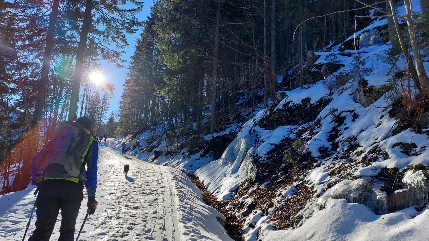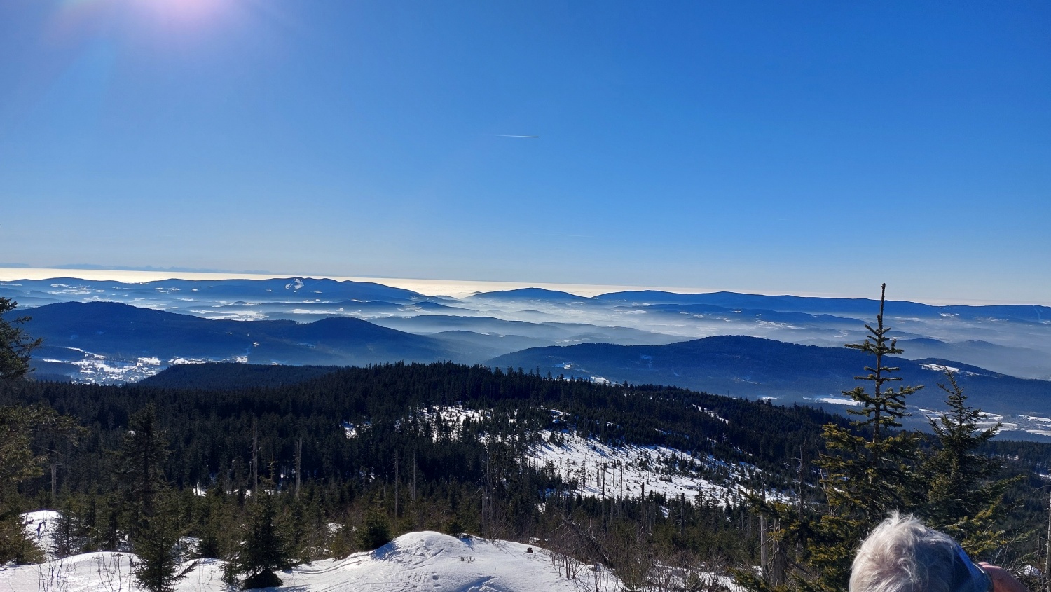 Am Samstag, den 18. Jan. 2025, trafen sich elf berg- und schitourenbegeisterte Mitglieder, um in Fahrgemeinschaften auf den Brennes zu fahren, dem Ausgangspunkt der Tour. Unter der Leitung von Tourenleiter Josef Schwaiberger begann der Weg nordseitig am Mühlbauernberg auf einer Forststraße, auf etwa 1000 m Seehöhe. Bei leichten Minusgraden ging es dann in Richtung Kleiner Arbersee, leider mussten die Schier das letzte Stück des Weges getragen werden, da in diesem lichten Waldstück die Schneeauflage noch ungenügend war. Ab dem nordseitigen Seeufer konnten nach dem Fototermin und bei strahlendem Sonnenschein die Schier wieder angeschnallt werden, obwohl der Weg bis zur Seehütte wegen der dünnen Schneedecke mit etwas Vorsicht zu begehen war. Ab dieser Hütte war dann die Schneeauflage perfekt und so konnte der Aufstieg über den Eggersberger Hütten- Schachten in Richtung Kleiner Arber beginnen. Im Vorfeld hatte der Tourenleiter die möglichen Wege mit den betroffenen Behörden des LRA Cham, bzw. mit dem Naturpark Oberer Bayerischer Wald abgeklärt, so dass der Weg über die Chamer Hütte und dann auf den Hochtoursteig zum Luchsplatzl möglich war. Von diesem Platz aus, der nach allen Seite eine tolle Aussicht bot, führte der Steig hinein in den dichten Wald, der am Gipfel des kleinen Arber auf 1384 m Höhe steht. Hier wurde, wie schon obligatorisch, eine kurze Brotzeitpause eingelegt, denn die Aussicht war bei diesem Wetter doch perfekt.