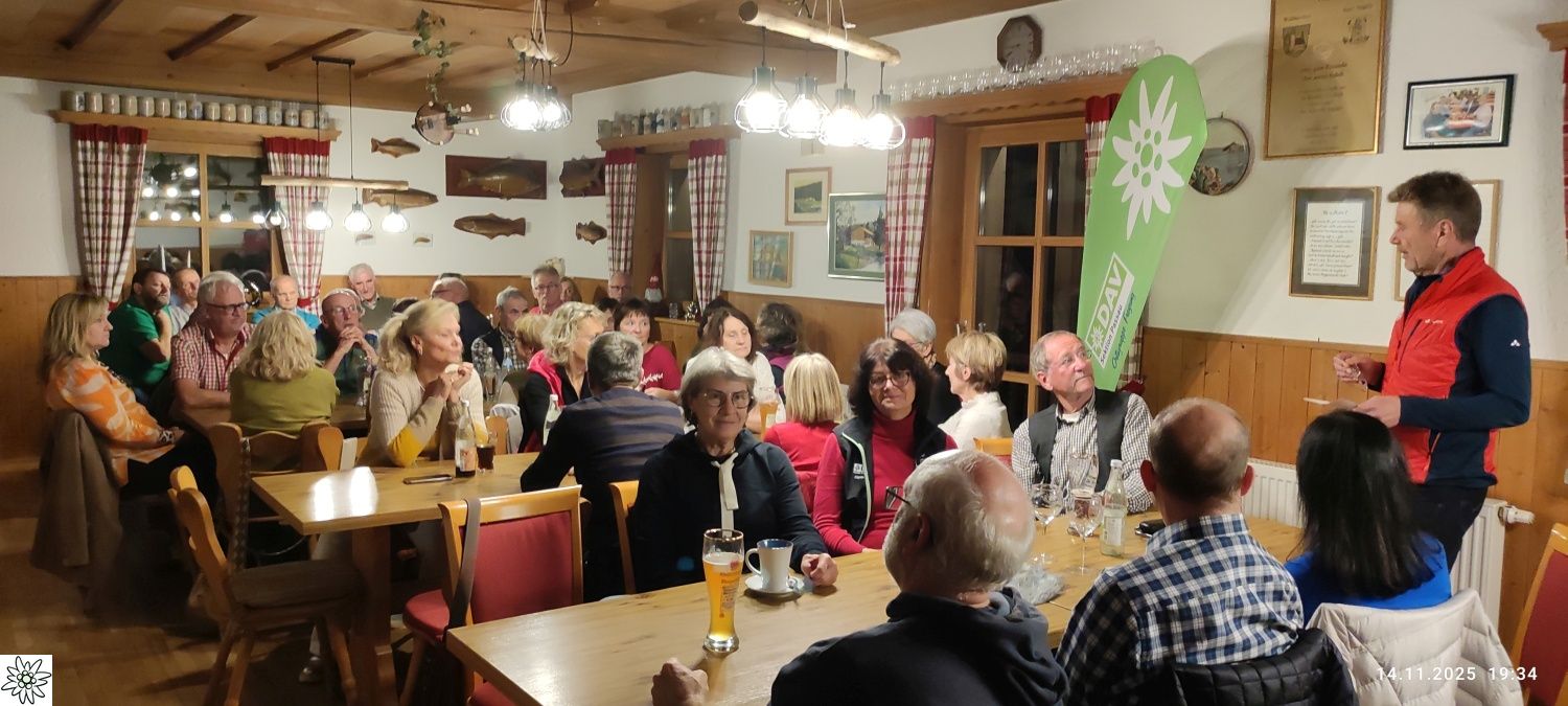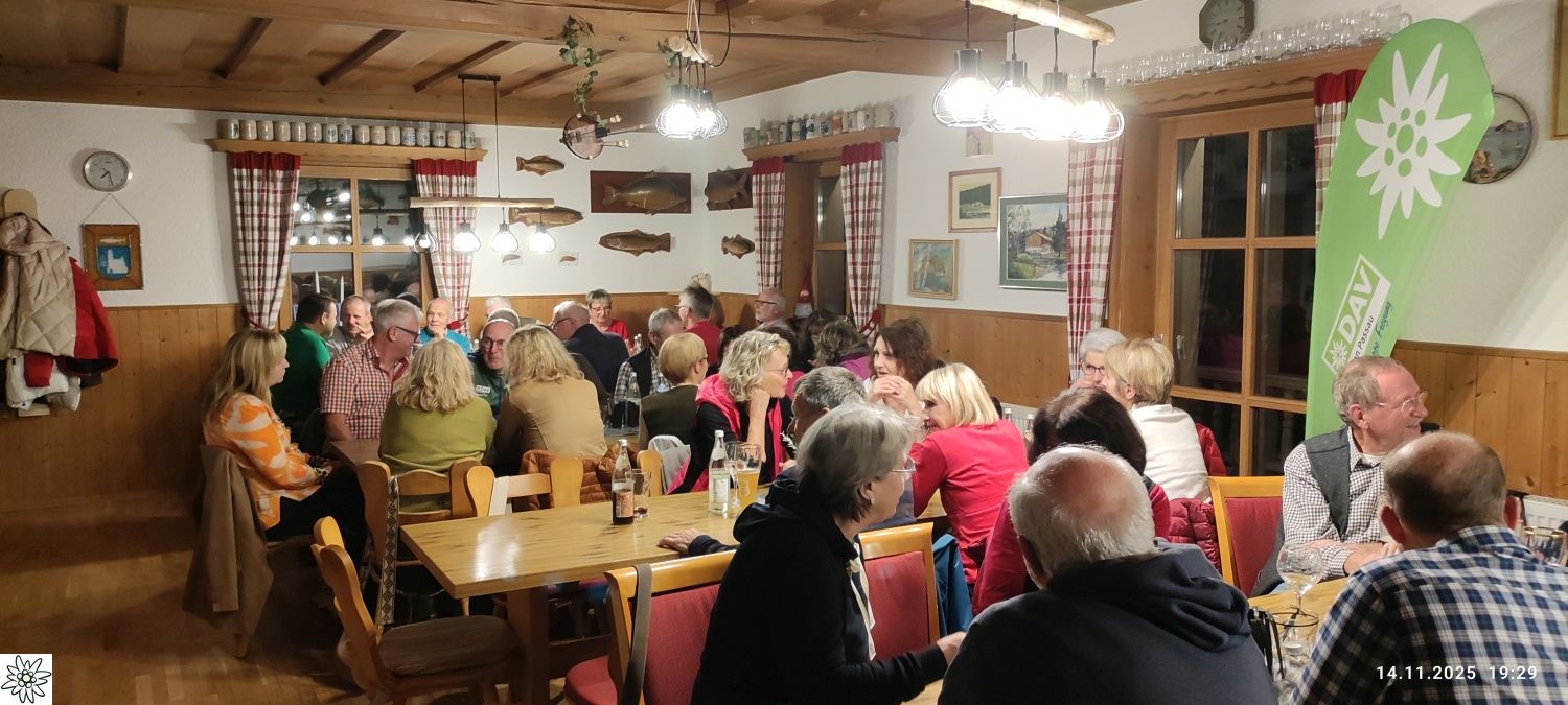 Nach den Herbstwanderungen in den Bergen und im Bayerischen Wald ist es nun schon zur guten Tradition geworden, die Saison mit einem Hüttenabend im Fischerhäusl des Fischereivereines Waldkirchen abzuschließen. Dieser fand dort heuer bereits zum vierten Mal statt. Anstatt des monatlichen Stammtischs im Vereinslokal Brodinger konnte der Vorsitzende der DAV- Ortsgruppe Freyung, Josef Schwaiberger, wieder eine stattliche Anzahl von Mitgliedern aus dem Landkreis Freyung/Grafenau, wie auch aus dem Landkreis Passau, begrüßen. Des Weiteren konnte auch Sepp Haselsteiner begrüßt werden, der, wie gewohnt, mit seiner Gitarre und Gesang für den musikalischen Rahmen sorgte. Der Vorsitzende bedankte sich natürlich auch bei den Aktiven vom Fischereiverein, die mit viel Engagement die Führung des Vereins und auch das Fischerhäusl auf komplett neue Füße gestellt haben – so mancher der Anwesenden konnte sich vom neuen Gebäude mit nagelneuer Küche und einem perfekt gestalteten Außenbereich, sowie den Veränderungen im Gastraum selbst überzeugen. So hat die Mannschaft des Fischervereins die bestellten Fische schon perfekt vorbereitet, da Manfred Eberl seine Anmeldelisten mit Essenswunsch in gewohnter Weise abgeliefert hat. Das bestellte Essen wurde in Buffetform bereitgestellt und die Mannschaft des Fischereivereins bewirtete mit Umsicht und Perfektion. Nach ein paar stimmungsvollen Liedern wurde dann der Nachtisch mit Kaffee und schmackhaften Kuchen vorbereitet – alle gebacken und bereitgestellt von den Mitgliedern. Dafür gab es vom Vorsitzenden ein großes „Vergelt´s Gott“ an die Spender.