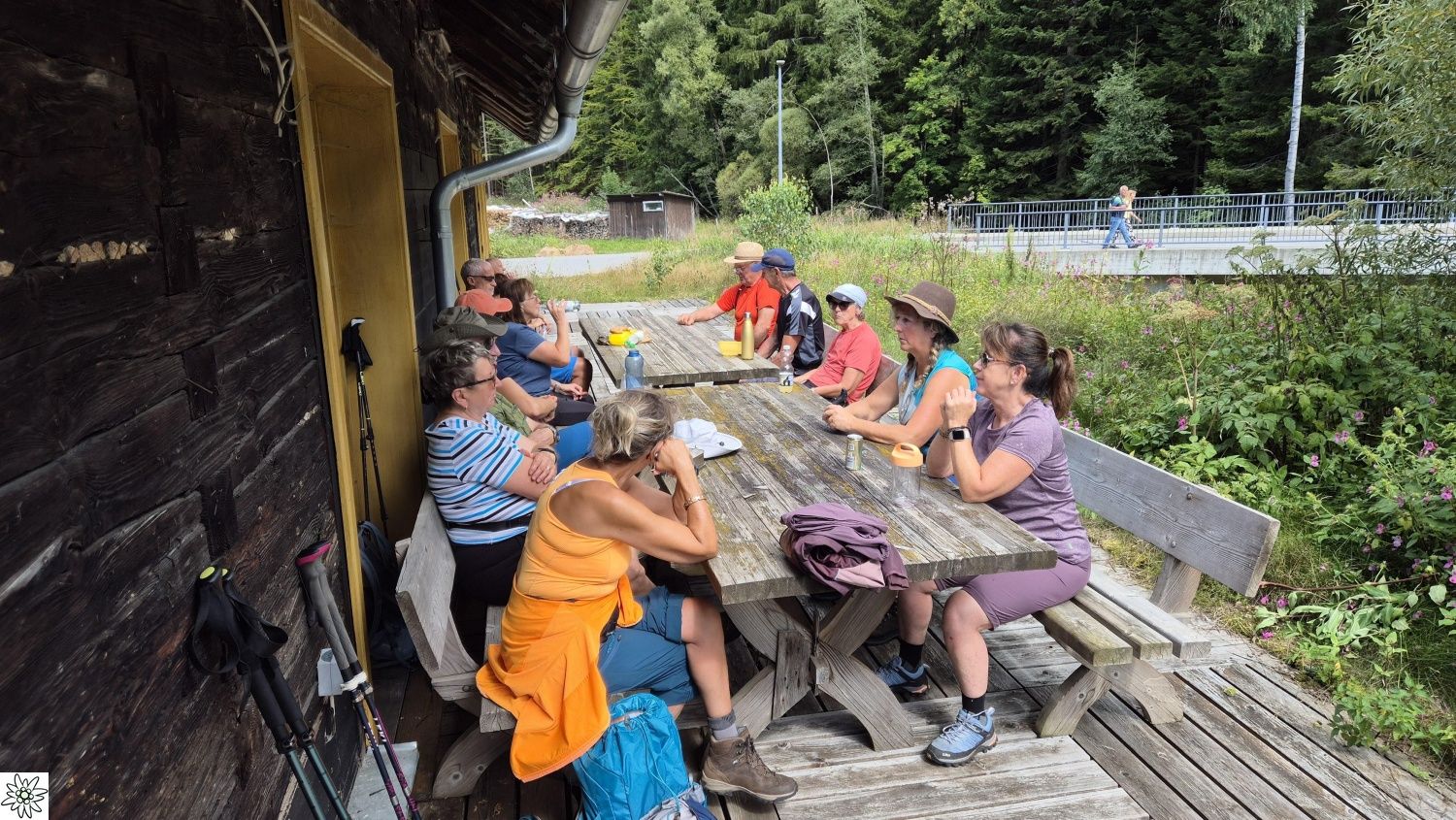 Unter dem Vordach eines der verlassenen großen Holzhäuser an der Seebachschleife fanden die Wanderer ein schattiges Plätzchen für eine zünftige Brotzeit. Hier befand sich vor über 150 Jahren die bedeutendste Spiegelschleife Bayerns. Von 1919 bis 1928 diente die Seebachschleife als Brillengläser-Schleiferei für das Regener Werk der Firma Rodenstock.