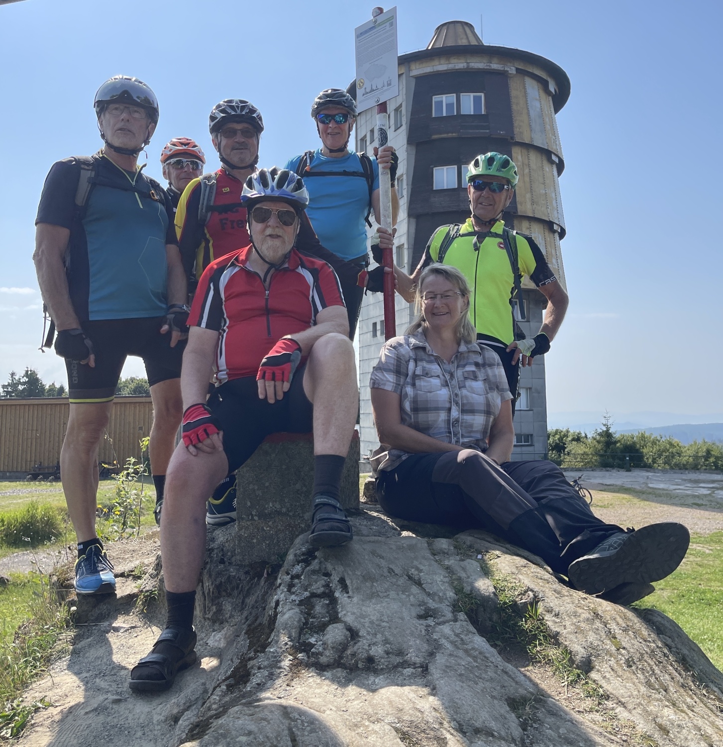 Die Teilnehmer starteten in Fahrgemeinschaften ab dem Parkplatz Brodinger in Freyung nach Furth im Wald. Ausgangspunkt dort war ein Parkplatz in der Nähe des Stadtzentrums. Die sieben E-Bike Fahrer komplettierten ihre Ausrüstung und schon ging es los, noch kurz durch die Stadt und dann über freies Feld, vorbei am Vogelherd auf 508 m Höhe, stets bergauf in Richtung Grenze und dem Tagesziel. Nach kurzem und anstrengendem Weg auf der Bundesstraße CHA40, ging die Fahrt vorbei am Schloss in Richtung Voitenberg, bis dann die Skipisten und Lifttrassen auf dem Dreiwappenweg gequert wurden. Immer in lichtem Wald, hinauf zum Brombeerriegel, wurde dann die Wappentafel „Drei Wappen“ (Churfürstentum Bayern – Königreich Böhmen – Herzogtum Pfalz) erreicht, wo der Weg in einen Waldsteig überging, der von allen Teilnehmern meisterhaft bewältigt wurde. Nun führte die Route weiter auf einer Forststraße, um den „Smrci“ mit 939 m Höhe herum, bis dann die Bendahütte (Waldhütte unter dem Brunnhäusl) erreicht war. Kurz vor „Halinova hora“, einer aufgelassenen Kaserne aus der Zeit des „Kalten Krieges“ führte eine Panzerstraße mit massiven Beton- Spurplatten, vorbei am Karel-Dvorak-Denkmal, hinauf zum Tagesziel, den 1042 m hohen Cerchov, der bis in die 1990er Jahre intensiv als Aufklärungsstation von der tschechoslowakischen Armee genutzt wurde. Neben dem 1904 als Aussichtsturm errichteten Kurz-Turm (benannt nach seinem Erbauer, seit 2000 wieder zugänglich), wurde 1987 durch die Armee ein zweiter, größerer Turm errichtet, der heute noch Flugsicherungszwecken dient und nicht zugänglich ist.