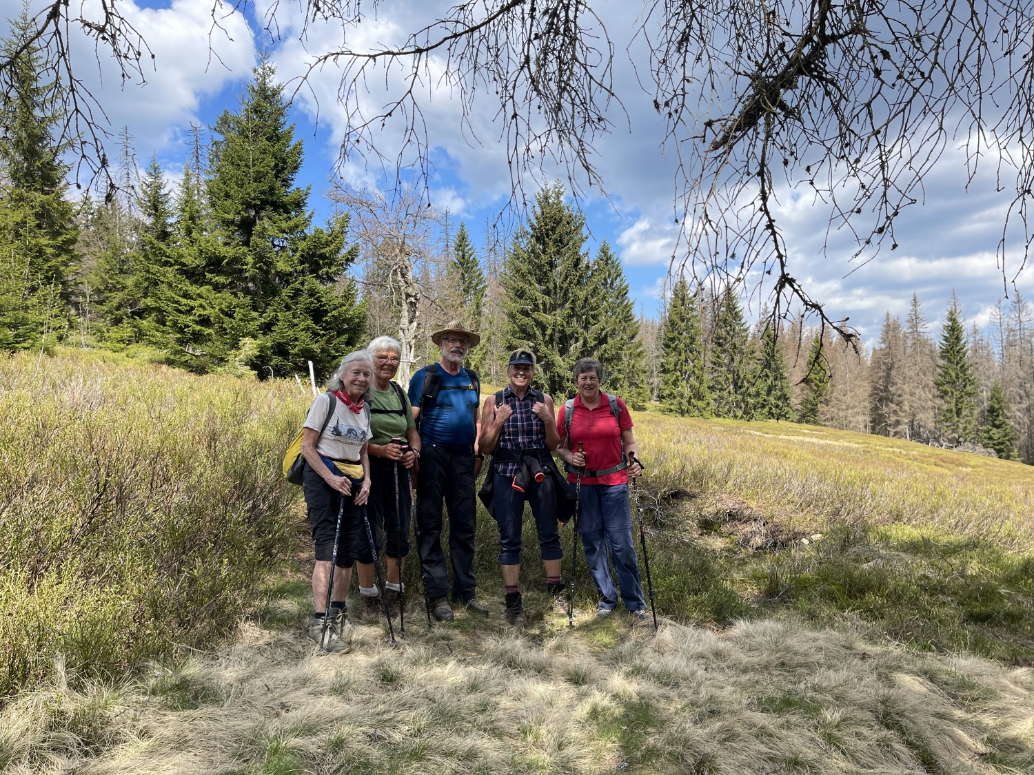 Die Umleitung führte immer entlang des Höllbachs zur Schachtenstraße und weiter zum Sulzschachten. Nun wurde der Weg etwas flacher und es war nicht zu übersehen, dass der Schnee noch nicht lange weggetaut ist. Am Falkenstein angekommen, wartete eine schöne Rundumsicht z.B. zum Mittagsberg und in Richtung Böhmisch Eisenstein auf die Gruppe. Am Gipfel gab es wie üblich das Gruppenfoto mit dem Gipfelkreuz, anschließend freuten sich die Wanderer auf die Einkehr in das Schutzhaus des Waldvereins, zur verdienten Pause mit vorzüglichem Essen.