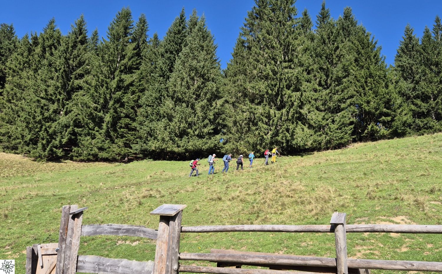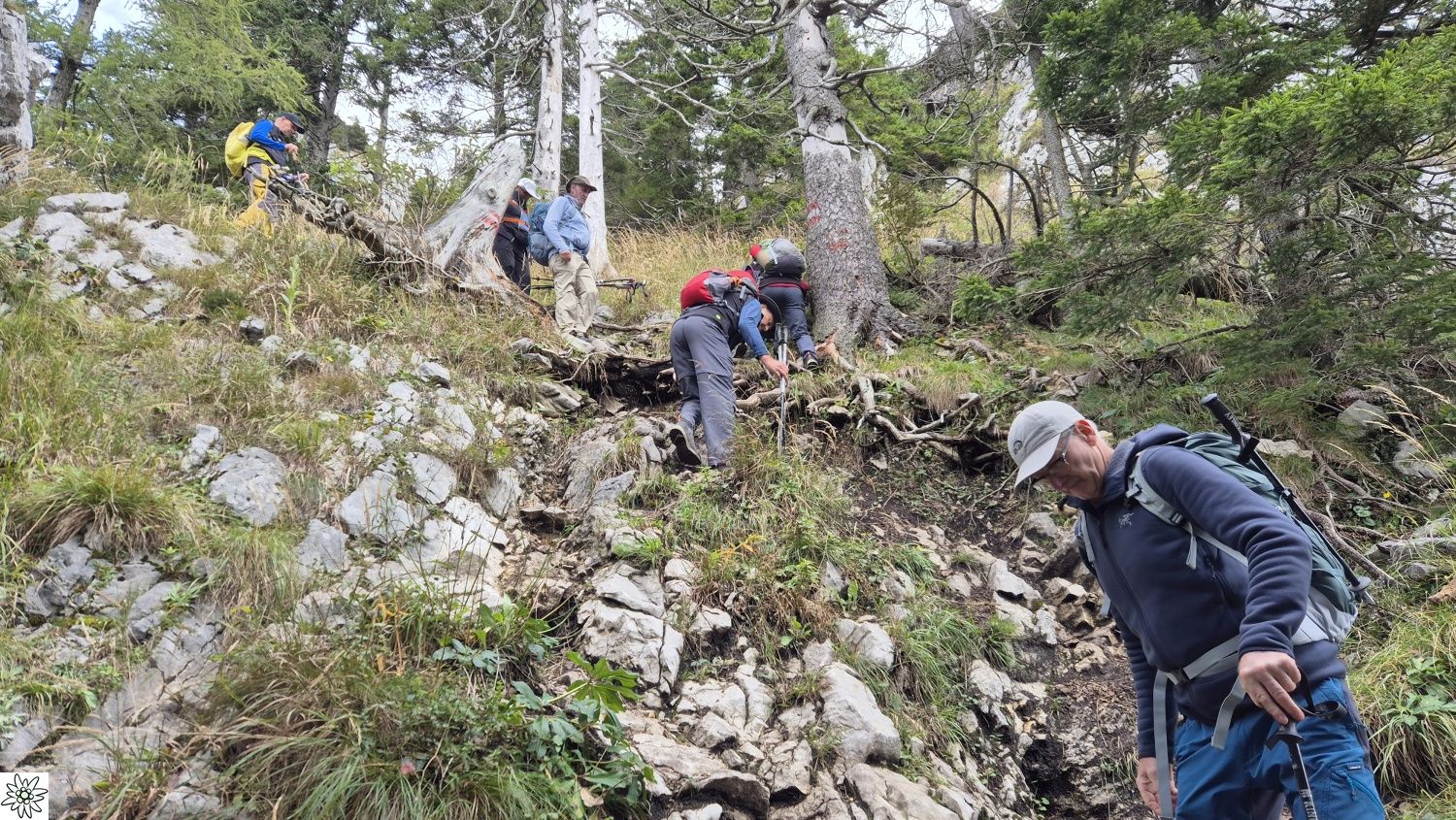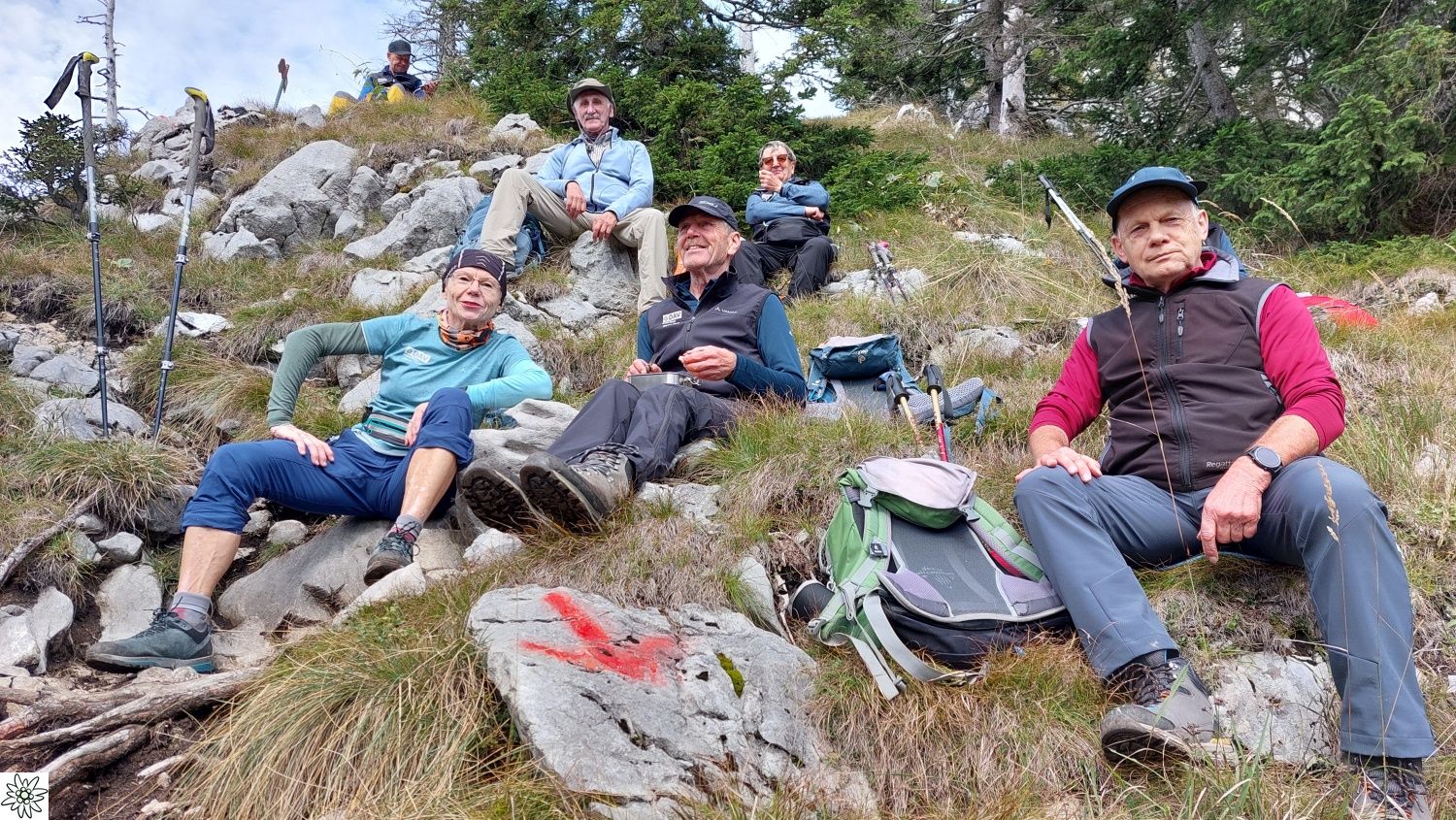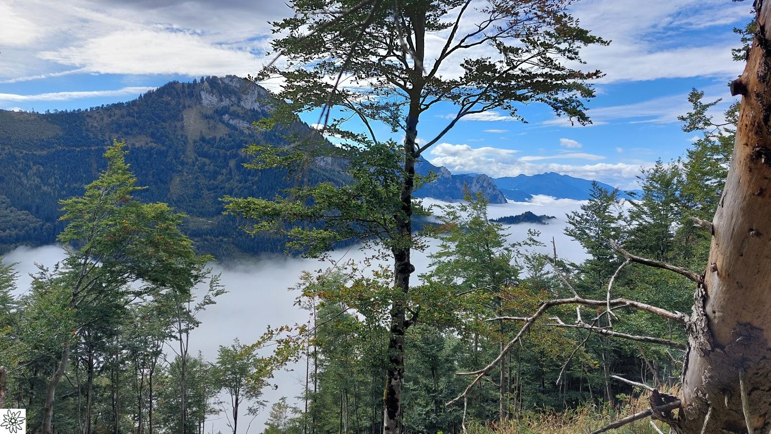 Die Touren gingen auf weniger bekannte Gipfel des Toten Gebirges. Am ersten Tag führte der Tourenleiter seine Begleiter per Seilbahn auf den 986 m hohen Grünberg und dann per pedes vorbei am Baumwipfelpfad mit seinem Aussichtsturm zu dem fast 100 m tiefer liegenden Laudachsee. Von dort führte der Weg hinein in einen teils versicherten Felsensteig, steil bergauf bis zur Hohen Scharte auf 1105 m. Ab hier ging es nun weiter aufwärts, immer entlang der Felsen- Abbruchkante, bis das Katzensteinfenster erreicht war. Nun führte der Felsensteig kurz abwärts, vorbei an der Gamsluckn und dann hinauf auf den Katzenstein mit 1349 m Höhe. Dort bot sich in herrlicher Ausblick zurück zum Laudachsee, auf den Traunsee und auf den benachbarten Traunstein, aber auch auf das Tagesziel des nächsten Tages. Der Rückweg entsprach dem Aufstiegsweg und wurde nur unterbrochen von einer Einkehr in der Ramsaualm knapp über dem Laudachsee. Nach der Rückkehr an der Talstation ging die Fahrt etwa 10 Km zum gebuchten Quartier „URZN“ in Altmünster, hoch über dem Traunsee. Mit schmackhaftem Essen und netten Gesprächen war der Abend schnell vorbei und alle freuten sich schon auf Tag zwei.