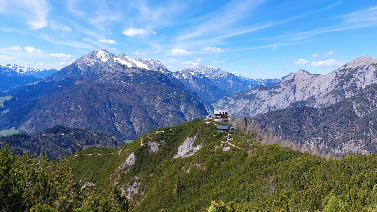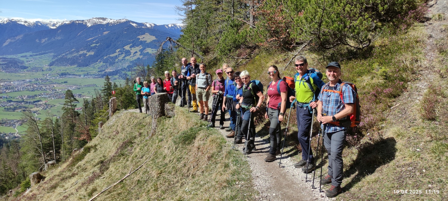 Bei herrlichem Frühjahrswetter und angenehmen Temperaturen war die Ortsgruppe mit zwei Kleinbussen unterwegs ab Waldkirchen an den Rand des „Steinernen Meer“, nach Saalfelden im Pinzgau. Am Waldparkplatz in Bachwinkl, auf ca. 900 m Seehöhe war dann um ca. 9.30 Uhr Start für den Aufstieg, zuerst über die Forststrasse und nach kurzem Anstieg über einen Waldsteig, der in Serpentinen steil bergauf führt, bis dann nach ein paar hundert Höhenmeter das erste Bankerl mit einer herrlichen Aussicht auf den Zeller See und den Alpenhauptkamm die Teilnehmer erfreute. Der Weg ging aber vorbei am Bankerl, bis dann auf ca. 1300 m Höhe der Jägersteig kreuzt wurde. Vom Waldsteig ging es dann hinein in das Latschengelände, wo auch der Weg wieder steiler wurde und die teils hohen Stufen gemeistert werden mussten. Die Zeit des Aufstieges verging wie im Flug, denn die Aussicht in das weite Teil um Saalfelden, Maria Alm, Leogang bis hin nach Zell am See und den Alpenhauptkamm lies keine Wünsche der Bergfreunde offen und schon war der Kienalkopf mit der Peter Wiechenthaler Hütte auf 1707 m über Adria (ü.A.) erreicht.