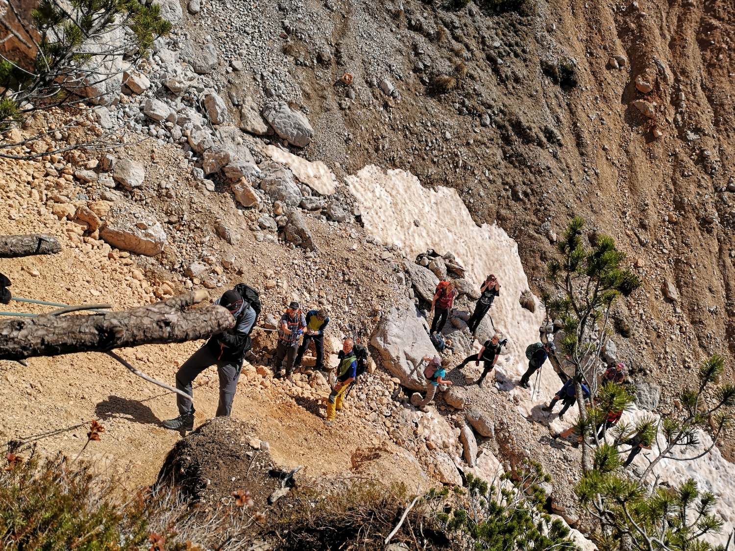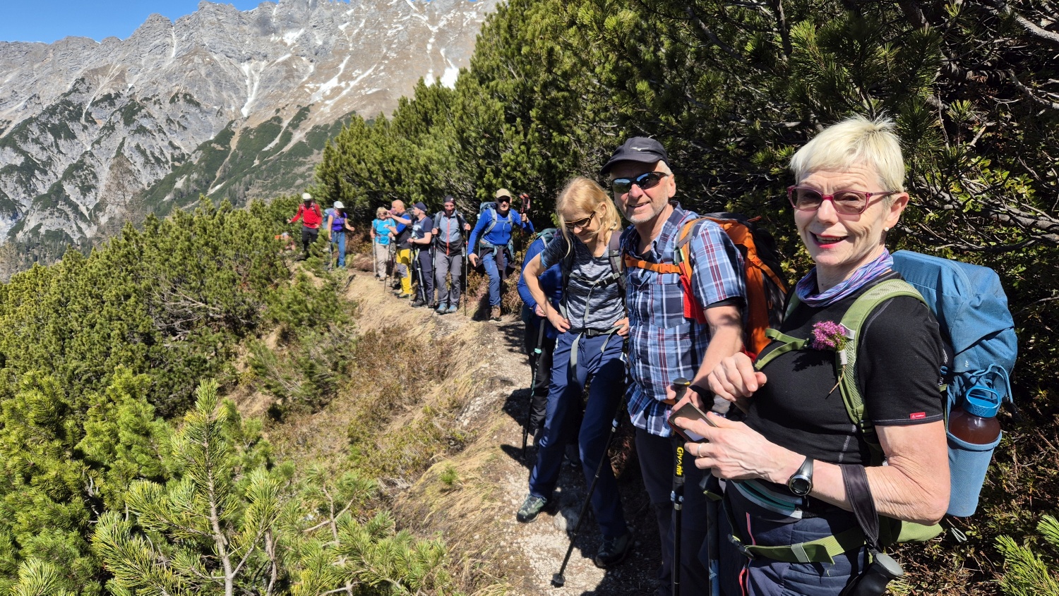 Bei so herrlichem Wetter und der sensationellen Aussicht, auch hinüber zur Passauer Hütte und dem Birnhorn, hat der Wanderleiter ein Herz für die Teilnehmer und schlug vor, auf der Hütte eine einstündige Pause einzulegen. – Schon war die Stunde vorbei und Josef S. rief zum Aufbruch. Im Vorfeld hatte er mit Hüttenwirt und Hüttenwart die Weg- bzw Schneeverhältnisse abgeklärt, jedoch keine sichere Auskunft bekommen, deshalb gab es hier auf der Hütte eine kurze Information für die Teilnehmer – „bei unsicheren Verhältnissen mach wir kehrt“. Nach einigen Schneefeldern zwischen den Latschen war aber dann der felsige Steig unterhalb des Persailhorns problemlos begehbar – alle hatten ihre Freude am Steig mit der tollen Aussicht ins Tal. In stetigem Auf und Ab, immer mit teils hohen Stufen, war es für alle einfach ein Erlebnis.