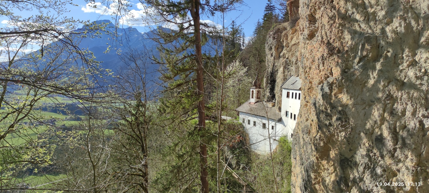 Über Almwiesen und anschließend durch lichten Wald ging es hinein über steile Stufen in die Felsabbrüche zur Palfenkapelle des hl. Georg als Einsiedelei mit der oberhalb in einer Felsnische gelegenen Georgskapelle. Nach kurzer Besichtigung war dann der Weg nicht mehr weit bis zum Parkplatz mit unseren Fahrzeugen. Alle sind wohlbehalten und nach so einem Tag überglücklich wieder im Tal angekommen. Auf der Heimfahrt wurde dann noch in Weißbach zu Kaffee und Kuchen eingekehrt, bevor dann die Fahrt nach Passau und Waldkirchen anstand.