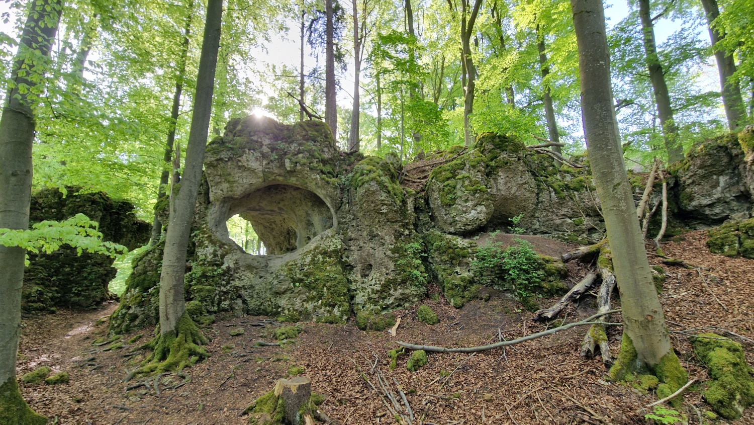 Nach dem Frühstück am zweiten Tag fuhr die Gruppe bei wiederum herrlichem Wetter nach Betzenstein, von wo die erste Wanderung dieses Tages „Rund um Betzenstein“ gestartet wurde. Ca. 500 m nach dem Parkplatz war schon das erste Ziel die Klauskirche, eine 32 m lange Durchgangshöhle erreicht. Durch diese führte der Wanderweg vorbei am Freibad und am Klettergarten zu einem Aussichtspunkt auf die Ortschaft. Das nächste Ziel, das Naturdenkmal Hexentor, ein fast kreisrundesFelsentor, das als keltischer Kraftort gilt, war bald darauf erreicht. Der Weiterweg führte entlang des Badersberges zum Berghäusl, einer Schutzhütte inmitten der Felsenwelt. Auf einem Treppenabstieg vorbei am Friedhof erreichte man durch den Torturm das denkmalgeschützte Ensemble der Altstadt von Betzenstein. Vorbei an der historischen Stadtmauer zweigte der Weg hinauf zum Schmidberg mit dem Aussichtsturm ab, wo man einen herrlichen Blick hinunter in die Ortschaft und zu den beiden Burgen gegenüber hatte. Der Markierung folgend kam die Gruppe vorbei an der Laufer Hütte zur Straße. Nach dem überqueren führte der Weg teils durch Buchenwald, teils am Waldrand auf dem „Pfad der Liebe“ vorbei an beeindruckenden Felslandschaften und entlang einer Siedlung zu einer Dorfstraße. Von hier ging es wieder bergauf zum Aussichtspunkt auf dem „Gerhardfelsen“. Von hier ging es wieder bergab durch einen schönen Laubwald bis zur Straße nach Stierberg, auf der die Gruppe rechts haltend wieder den Parkplatz in Betzenstein erreichte.