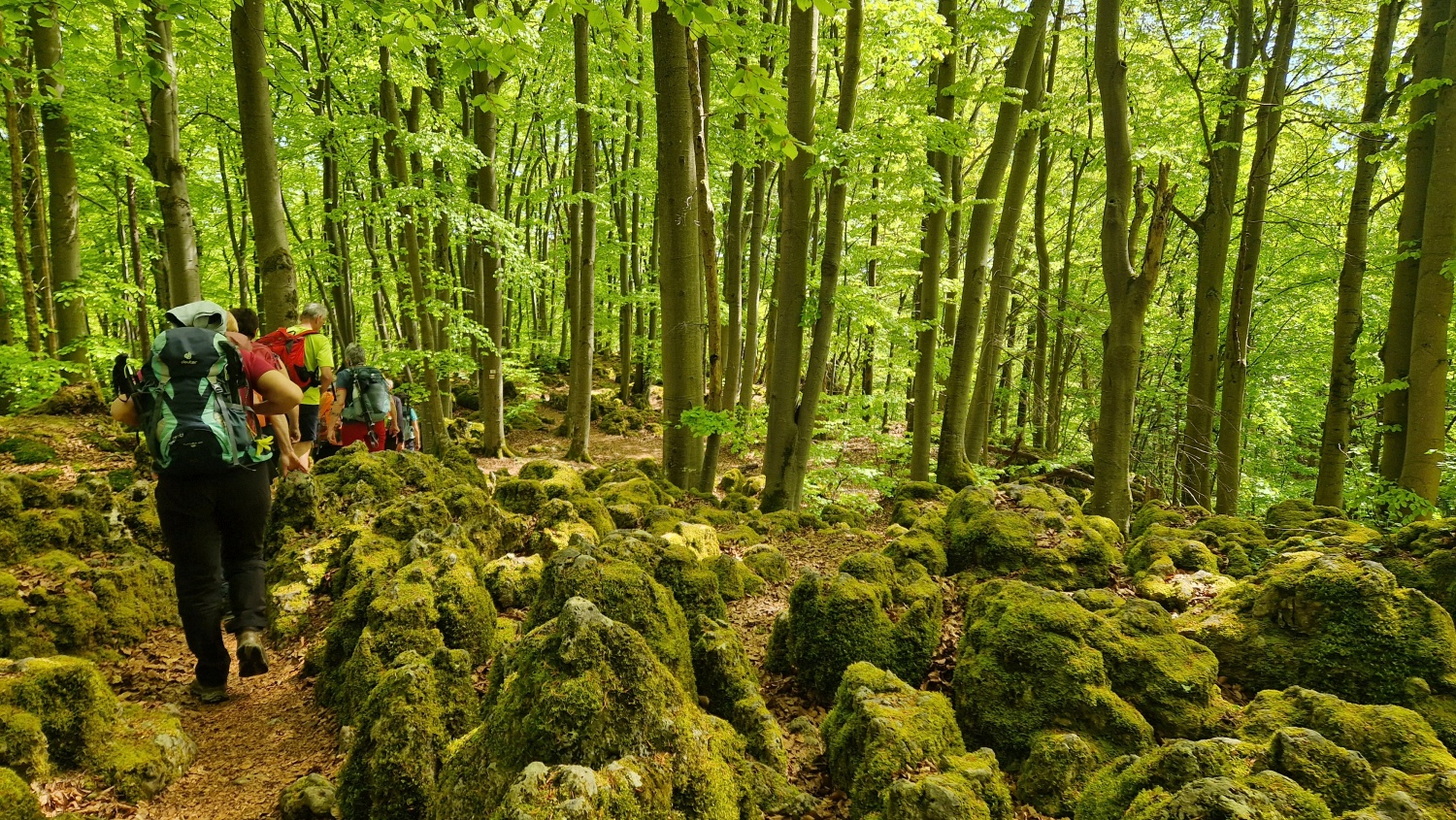 Von hier starte man mit den Fahrzeugen zum zweiten Ziel dieses Tages, den Eibgrat, zum Wanderparkplatz nach Spies. Auf diesem über 1 km langen anspruchsvollen Felsensteig war absolute Trittsicherheit und Schwindelfreiheit erforderlich. Zunächst führte der Weg am Waldrand entlang bis zu einem Felsdurchlass, der den Beginn des malerischen Steigs markierte. Der Weg führte durch enge Spalten und über Felsbrücken überraschend an den Fuß der Felsen. Danach erklimmt eine steile Leiter wieder einen Aussichtspunkt, mit 595 m der höchste Punkt des Grats und den Hohen Kamm. Immer wieder auf und ab durch eine abwechslungsreiche Felslandschaft erreichte man durch einen schmalen Durchschlupf das Ende des Eibgrats. Dem quer verlaufenden Weg rechts folgend erreichte die Gruppe auf Wald- und zuletzt Wiesenwegen wieder den Wanderparkplatz in Spies. Von hier trat die Gruppe die Heimfahrt an und erreichte nach einer Kaffeepause in der Jura-Raststätte nach zwei herrlichen Wandertagen in der Fränkischen Schweiz gesund und wohlbehalten wieder Waldkirchen.