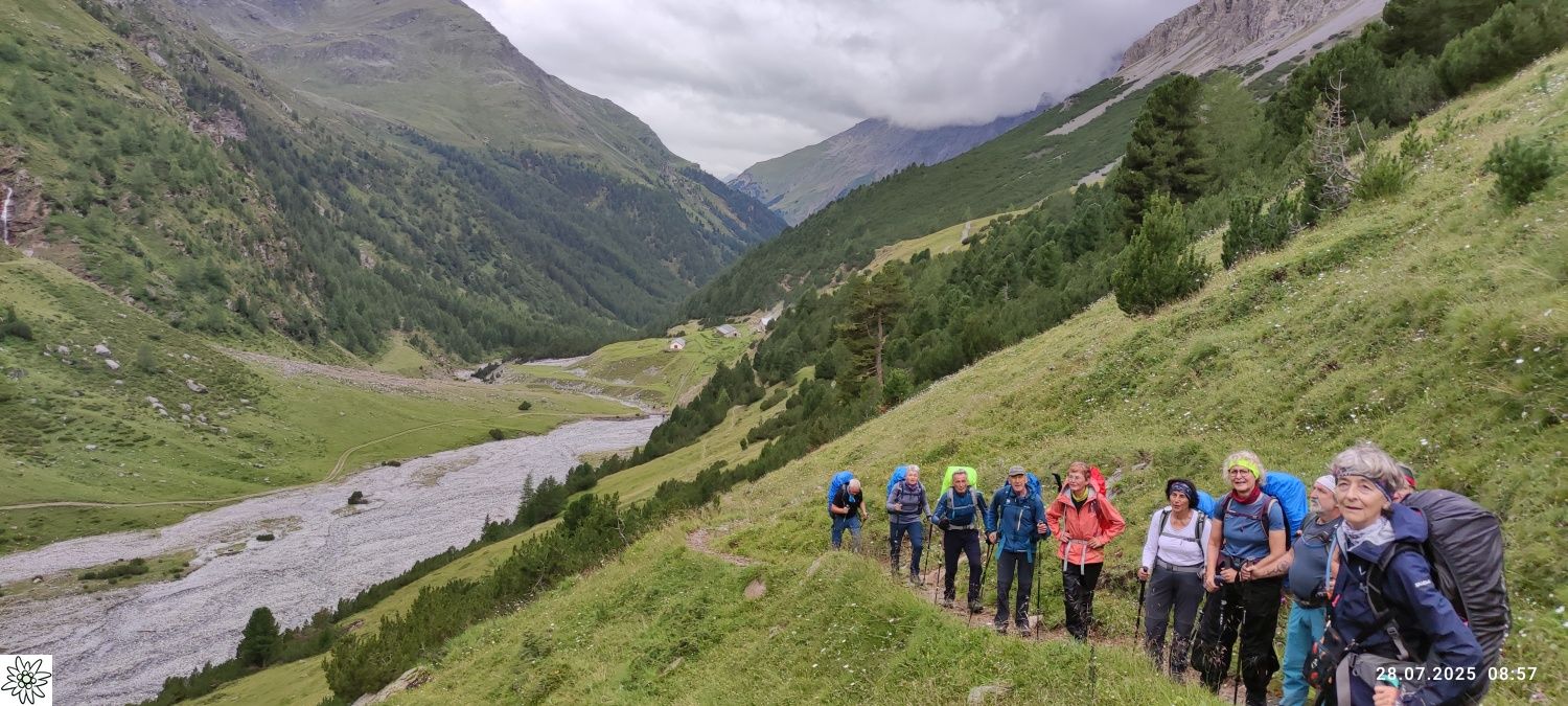 Im Rahmen dieses Projektes hat Hans Donaubauer Wanderleiter der DAV Sektion Passau, Ortsgruppe Freyung, eine 4-tägige Bergtour von Bormio bis zum Gaviapass organisiert. Im 9-Sitzer Bus war schon die Anreise über den Umbrail Pass ein kleines Abenteuer. Gegen Mittag war der Startpunkt oberhalb von Bormio erreicht. Durch märchenhaften Lärchenwald ging es auf dem Pedemontana della Reit hinein in das Valle dello Zebru, am rauschenden Gletscherfluss entlang, bis zur ersten Übernachtungsstation, dem Rifugio Campo auf 2000 m. Eine kleine Almhütte, die von jungen Leuten sehr gut geführt wird.