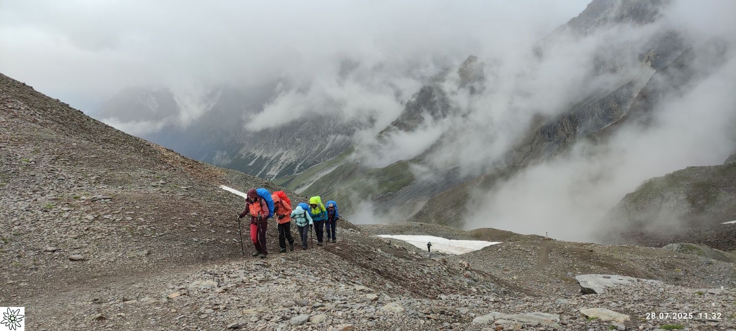 Am zweiten Tag stand eine wahre Königsetappe auf dem Programm. Am Fuß von Königsspitze und Monte Cevedale, ging es aus dem satten Grün der Almwiesen hinauf ins karge Bergland, bis zur magischen Dreitausender-Grenze am Zebrupass. Tiefhängende Wolken gaben immer wieder den Blick frei auf die Bergriesen, allesamt über 3500 m, mit ihren Gletscherzungen – zum Greifen nahe. Erfüllt von diesen Eindrücken stieg die Gruppe ins grüne Valle die Forni ab, zur zweiten Unterkunft, dem Stella Alpina auf 2061 m, schon mehr Pension als Berghütte, aber urgemütlich.
