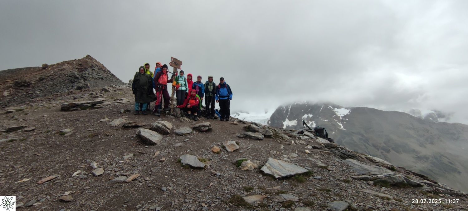 Der dritte Tag brachte den ersehnten strahlend blauen Himmel. Perfekt für die atemberaubende Wanderung auf den Dosso Tresero 2356 m, mit herrlichem Ausblick hinab auf Santa Caterina und zurück auf die gesamte Route der vergangenen Tage. Weiter ging es entlang von Wasserfällen und über zahlreiche Gletscherbäche, die allesamt den Torrente Gavia speisen. Langsam kam das Ziel, der Gaviapass 2652 m in Sicht, eingerahmt vom Corno dei Tre Signori 3360 m und dem Monte Gavia 3220 m. Direkt auf der Passhöhe lag die letzte Übernachtungsstation, das Rifugio Bonetta. Hoch frequentiert von unzähligen Motorrad-Bikern und Radfahrern, welche die berühmte Bergetappe der „giro d´italia“ fahren wollen. Nach kurzer Rast war noch genügend Zeit, den Monte Gavia 3220 m zu besteigen, um nochmal den herrlichen Rundumblick auf die Ortler Alpen zu genießen.