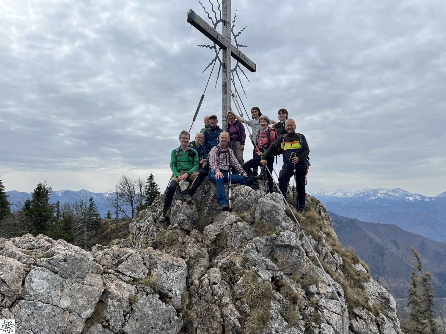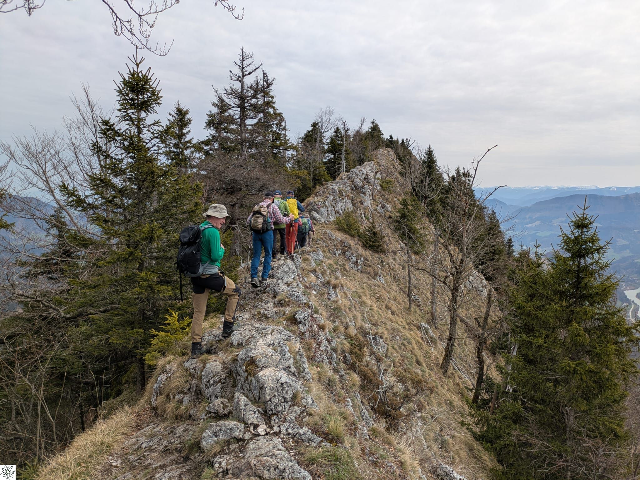 Los ging es um 09:00 bei dem kleinen Parkplatz beim Hackerbauer. Wir kamen am Pfennigstein vorbei, dann ging es steil hinauf zum Grat. Diesen folgten wir dann bis zum steinernen Jager. Hier machten wir eine gemütliche Pause und genossen die Aussicht auf Priel, Kremsmauer und Hoher Nock, die alle noch mit Schnee bedeckt waren.