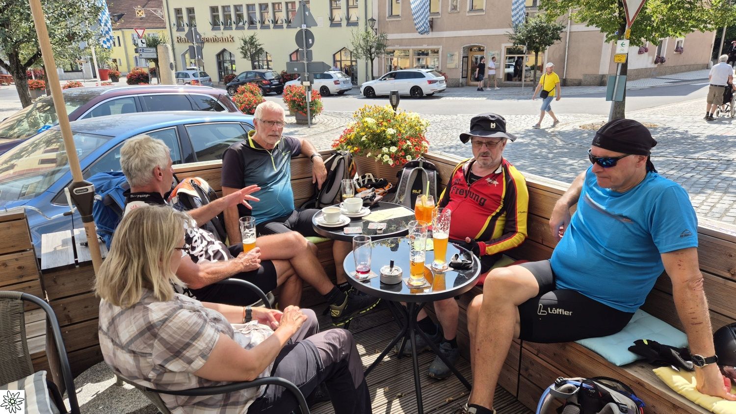Bei der Durchfahrt durch den Stadtplatz mit den Kulissen des Drachenstiches wurde beschlossen, den Drachensee zu umrunden und schließlich noch die Drachenhöhle mit dem Drachen zu bewundern. Der Tourtag endete (nach etwa 1000 Höhenmetern) mit einer gemütlichen Einkehr auf der Terrasse eines Cafes unterhalb des Stadtplatzes, bevor dann alle den Heimweg antraten.